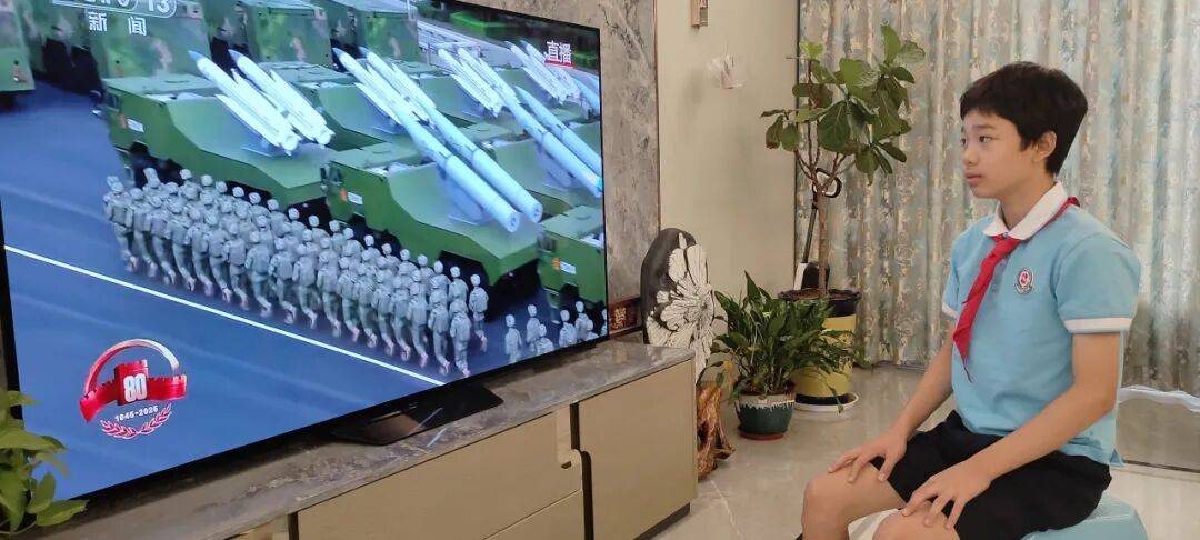 今天,我怀着无比激动的心情观看了纪念抗日战争暨世界反法西斯战争胜利80周年的阅兵活动。看着整齐划一的方阵和威武雄壮的装备,我的心里既骄傲又温暖。当战机曳着绚丽的长虹掠过天际,我情不自禁地握紧双拳,那熠熠生辉的不是冰冷的弹头,而是祖国为我们编织的安全罩!如今我们的武器装备如此先进,但我明白它们的存在是为了捍卫和平。我要加倍努力学习科学文化知识,用智慧筑牢祖国的钢铁长城,让历史的阴霾永远消散在阳光之下!